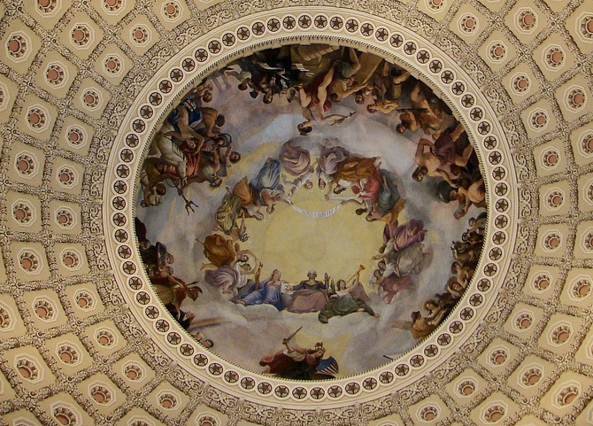 In other words, apotheosis is when we elevate a human or any other thing to the level of a god. Above is an 1865 painting by Constantino Brumidi, that is in the eye of the rotunda of the Capitol Building in Washington D.C. It is called “The Apotheosis of George Washington,” and shows Washington rising in glory, flanked by Liberty and Victory/Fame.